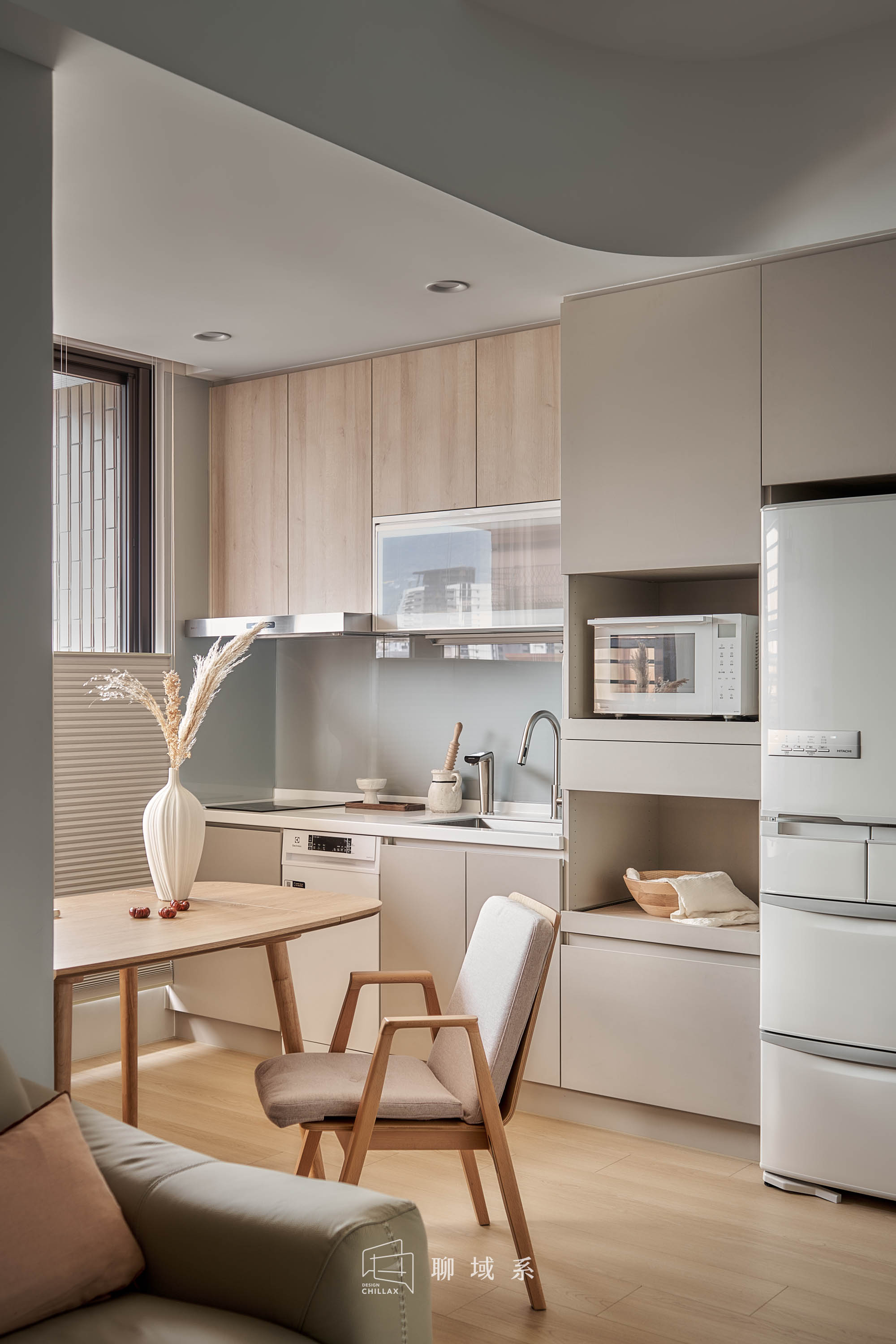 風格的選定是她拿了很多喜歡的照片都屬於簡約與日系的裝潢,其中還有聊域系之前做過的現代侘寂風的家,她喜歡簡單但有質感的風格,所以我們就在選定了幾個日系風格的元素(像是無印風的木質感、侘寂風塗料的靜謐感),把它們放進簡約的架構裡面,讓風格乾淨俐落但又有質感。