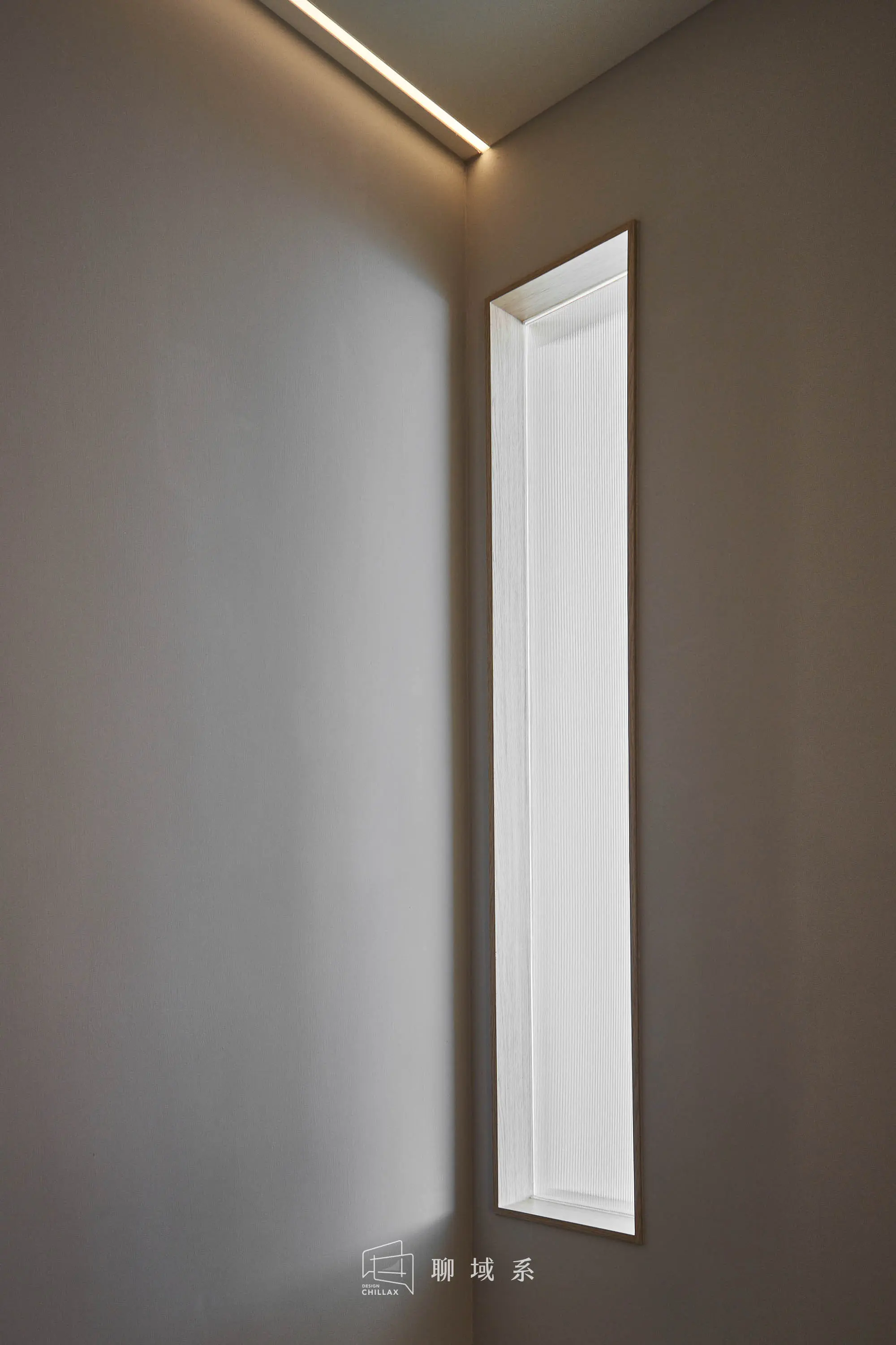 玄關最裡面的儲藏室並不是完全封閉的,我們希望讓它可以跟整個空間有互動,不是因為只是用來收納雜物就被排擠在外,所以我們在它與客廳之間的牆開了一個半透明的小窗,讓客廳的光可以透入,因為是半透明的所以也不會讓雜物很赤裸的出現在客廳的視覺範圍內,最後在用條燈貫穿兩個空間,這樣就把它們銜接在一起了。