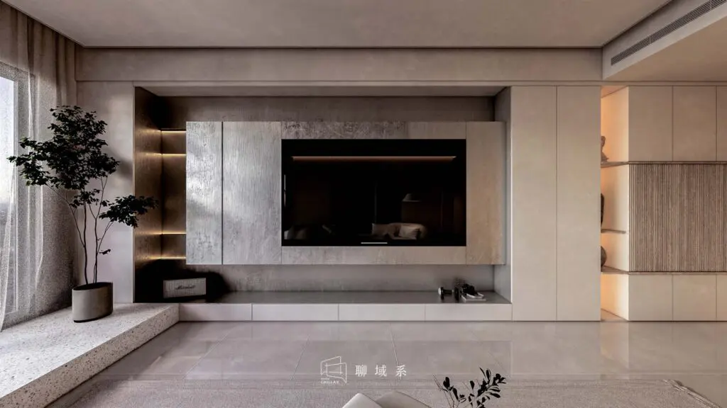 作為客廳主視覺的電視牆,我們做了特別的設計規劃,希望在簡約設計中創造出一種現代工藝美學,而不是傳統的黑灰白色調。因此,我們選擇了鈦銀色系的不鏽鋼材質,借助其獨特的金屬髮絲紋理和光澤反射特性,為空間帶來動態的視覺效果。大面積的金屬不僅增添了科技工藝的質感,也可以為整體空間的前後層次感增添了豐富度。